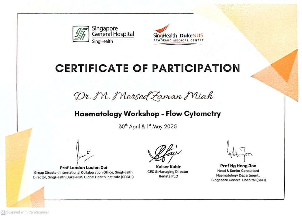15. Certificate of Participation for “Haematology Workshop – Flow Cytometry” by Singapore General Hospital (30th April & 1st May 2025)